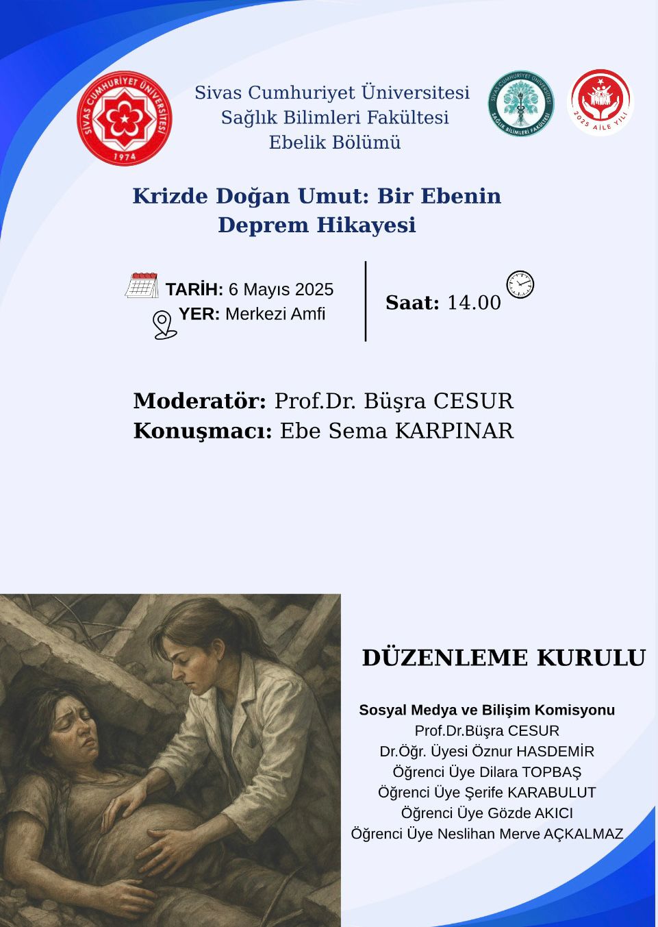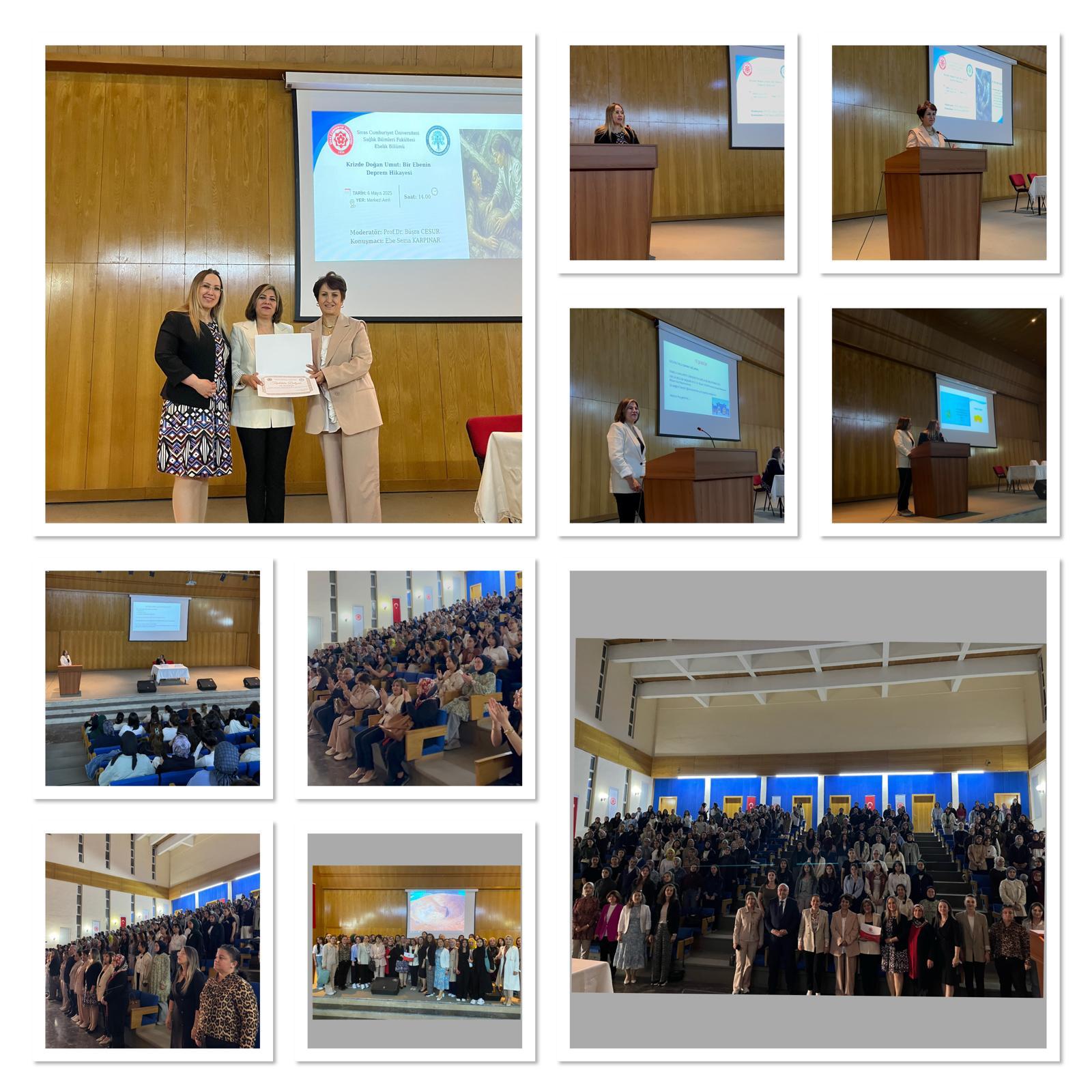 Sivas Cumhuriyet Üniversitesi Sağlık Bilimleri Fakültesi Ebelik Bölümü tarafından, 5 Mayıs Dünya Ebeler Günü etkinlikleri kapsamında düzenlenen “Krizde Doğan Umut: Bir Ebenin Deprem Hikayesi” başlıklı program, 6 Mayıs 2025 tarihinde Merkezi Amfi’de yoğun katılımla gerçekleştirildi.