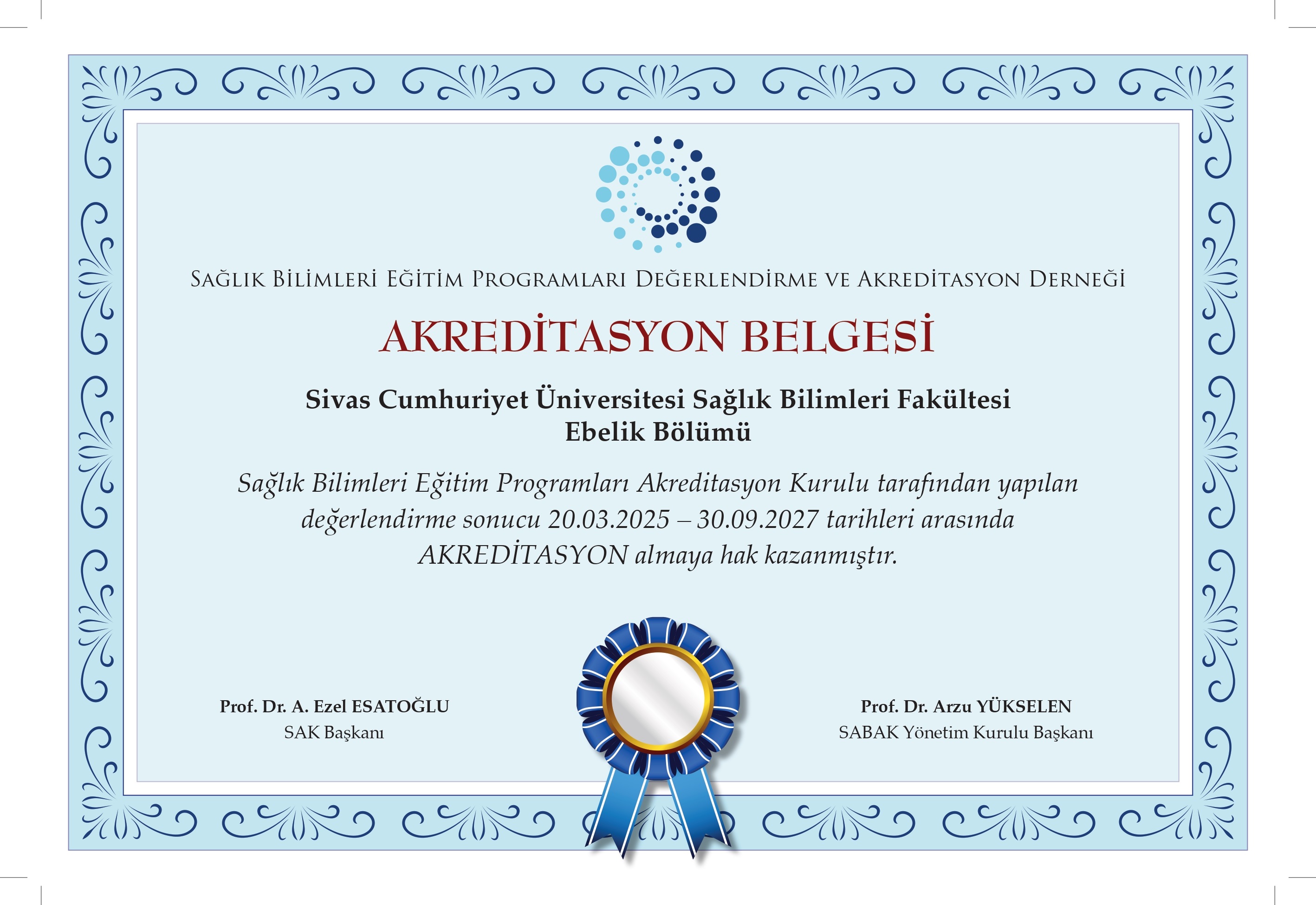 Sivas Cumhuriyet Üniversitesi Sağlık Bilimleri Fakültesi Ebelik Bölümü, Sağlık Bilimleri Eğitim Programları Değerlendirme ve Akreditasyon Derneği (SABAK) tarafından yürütülen kapsamlı değerlendirme süreci sonucunda, 20 Mart 2025 – 30 Eylül 2027 tarihleri arasında geçerli olmak üzere yeniden akreditasyon almaya hak kazanmıştır.