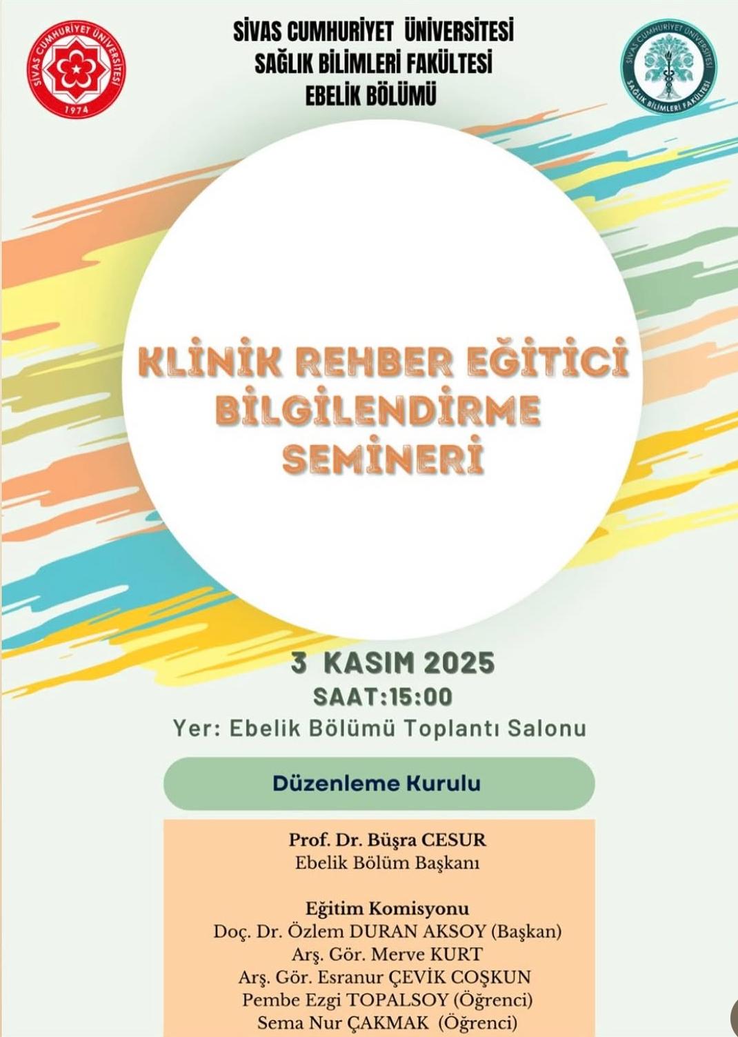 Ebelik Bölüm Başkanlığı ve Ebelik Bölümü Eğitim Komisyonu tarafından düzenlenen Klinik Rehber Eğitici Bilgilendirme Semineri, 3 Kasım 2025 tarihinde saat 15.00’te Ebelik Bölümü Toplantı Salonu’nda gerçekleştirildi. Seminere; Normal Doğum ve Doğum Sonrası Dönem, Yenidoğan Sağlığı ve Hastalıkları ile Doğum Öncesi Dönem-I dersleri için görevlendirilen toplam 6 klinik rehber eğitici ile bölüm öğretim elemanları katıldı.