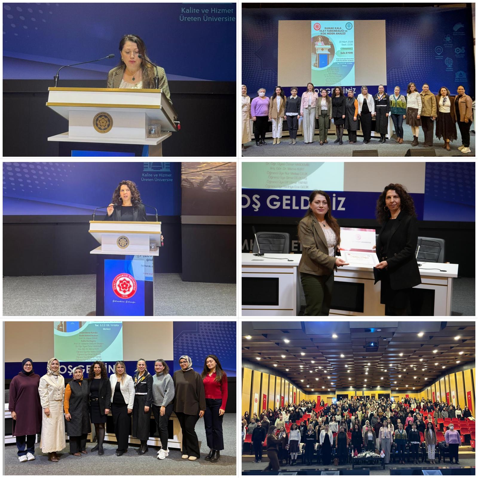 Sivas Cumhuriyet Üniversitesi Sağlık Bilimleri Fakültesi Ebelik Bölüm Başkanlığı ile Ebelik Bölümü Kalite Komisyonu tarafından düzenlenen “Ramak Kala Olay Farkındalığı ve Kök Neden Analizi” konulu konferans, 10 Mart 2026 tarihinde 100. Yıl Kültür Merkezi’nde gerçekleştirildi. Etkinliğe Sağlık Bilimleri Fakültesi Dekanı Prof. Dr. Selma SABANCIOĞULLARI, Suşehri Sağlık Yüksekokulu Müdürü Dr. Öğr. Üyesi ARZUHAN ÇETİNDAĞ, Sağlık Bilimleri Fakültesi Dekan Yardımcıları Prof. Dr. Gülseren DAĞLAR ve Dr. Öğr. Üyesi Nurcan BAĞLAM, Ebelik Bölüm Başkanı Prof. Dr. Büşra CESUR, Hafik Kamer Örnek Meslek Yüksekokulu, Çocuk Bakımı ve Gençlik Hizmetleri Bölümü, Çocuk Gelişimi Bölüm Başkanı Dr. Öğr. Üyesi Özlem NALDÖKEN, öğretim elemanları ve çok sayıda öğrenci katılım sağladı.