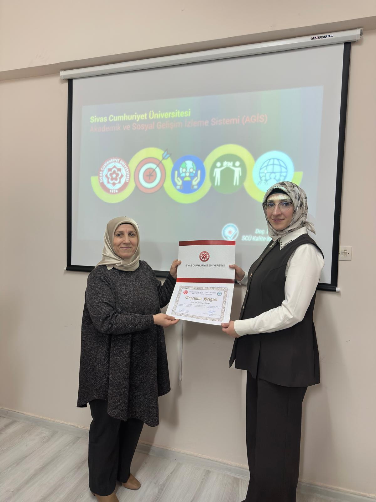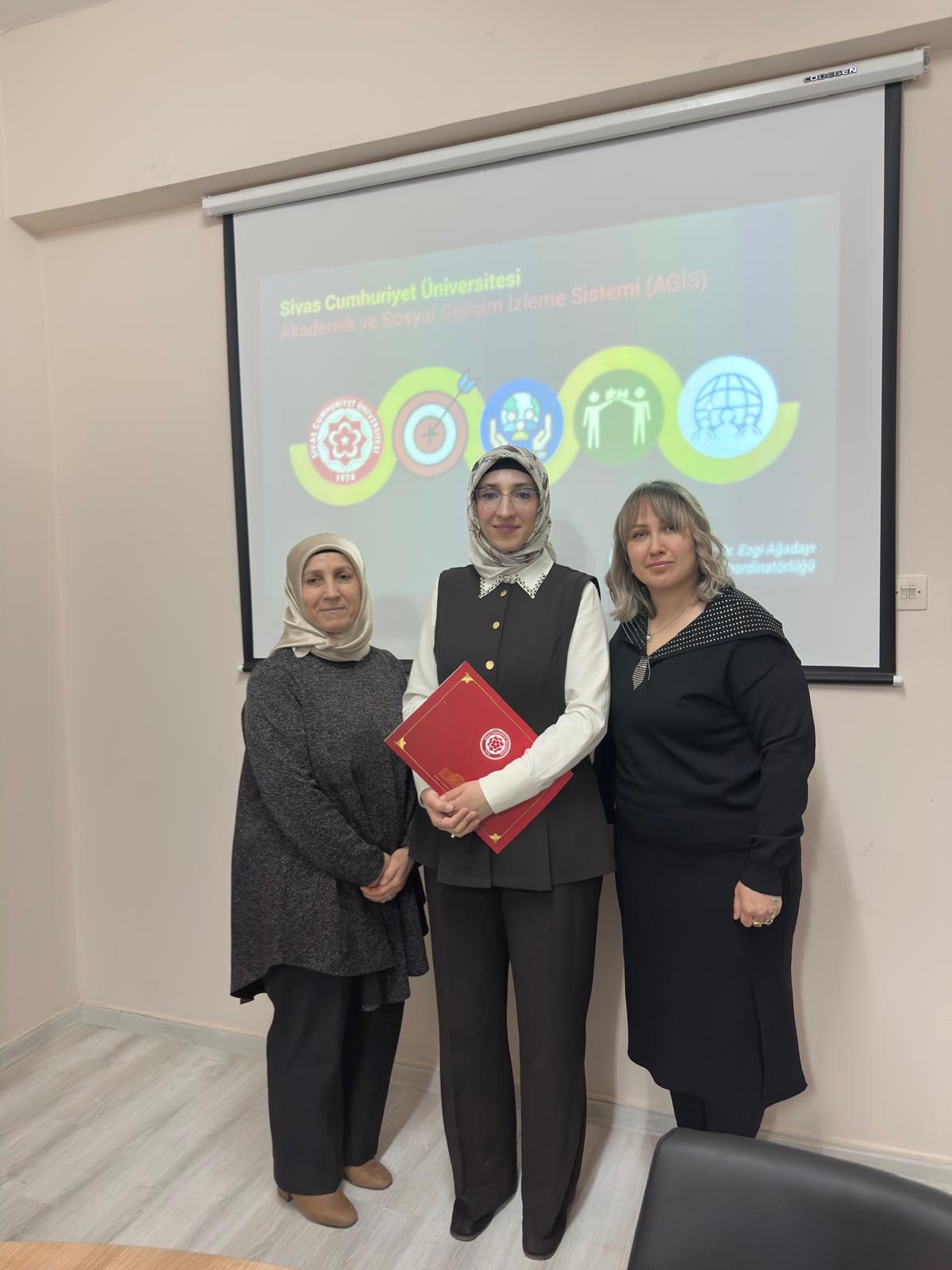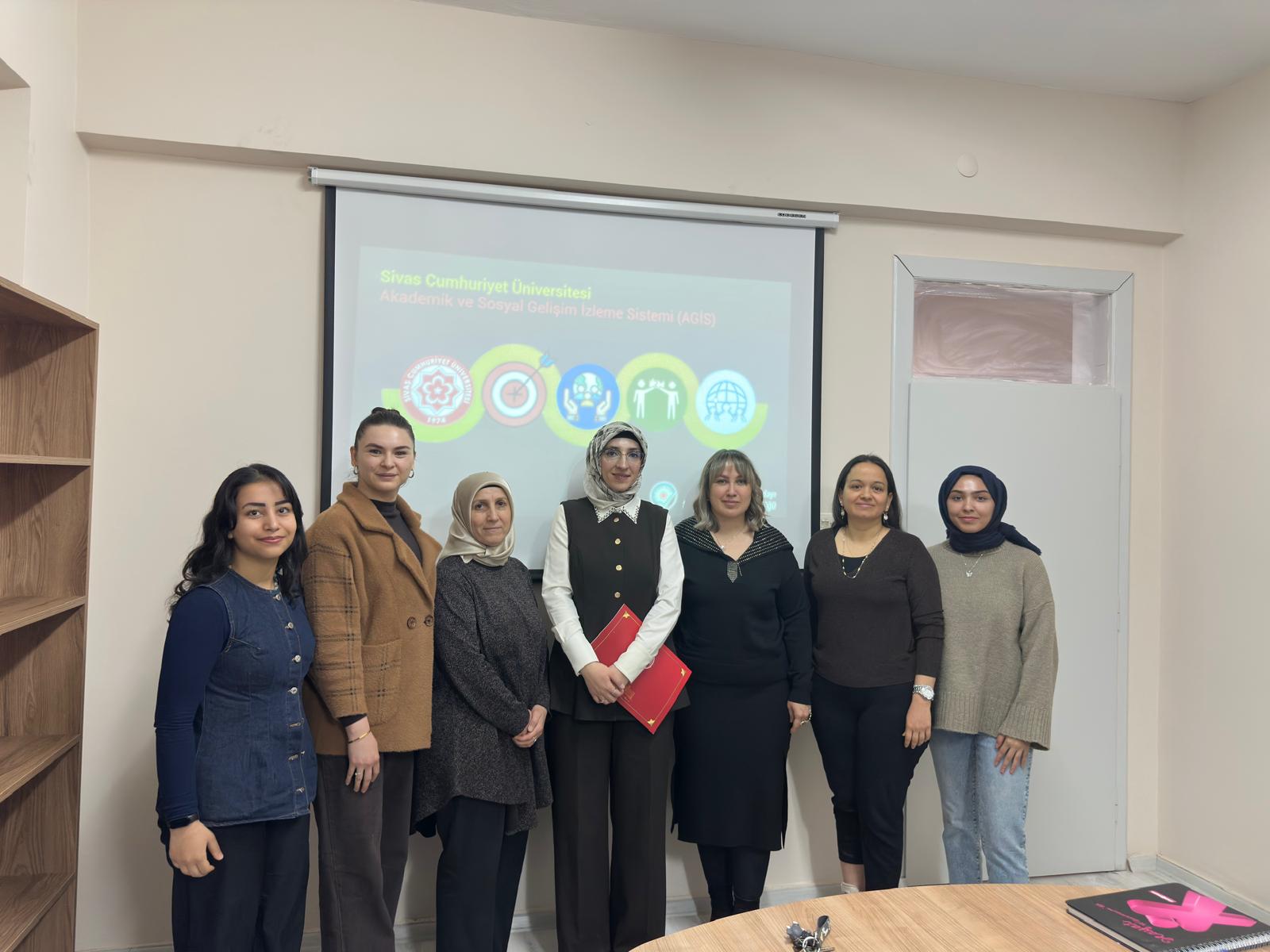 Sivas Cumhuriyet Üniversitesi Sağlık Bilimleri Fakültesi Ebelik Bölüm Başkanlığı ile Ebelik Bölümü Akademik ve Kariyer Danışmanlığı Komisyonu tarafından düzenlenen “Akademik ve Sosyal Gelişim İzleme Sistemi (AGİS) kapsamında yer alan Sosyal Transkript ve Danışman Görüşme Modülü Tanıtım ve Kullanım Eğitimi” gerçekleştirildi.